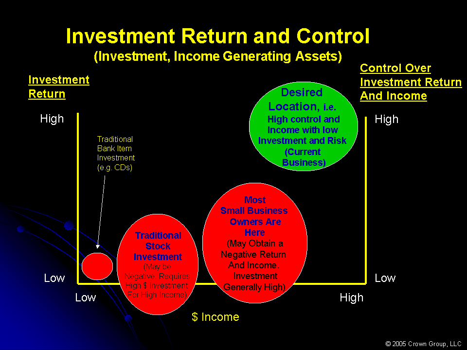 The more income obtained from traditional investment sources (CDs, Stocks, Businesses) the more one has to invest, i.e. a high income from stocks generally requires a high $ investment. Additionally you have virtually no control over investment income from stocks or CDs and limited control with a traditional business. However, more "modern" business opportunities (e.g. internet, home based etc) one generally has the ability to change rapidly from one product or business approach to another with little additional investment in time or money and therefore can quickly take advantage of changing market conditions. A more traditional business has much more difficulty doing this.